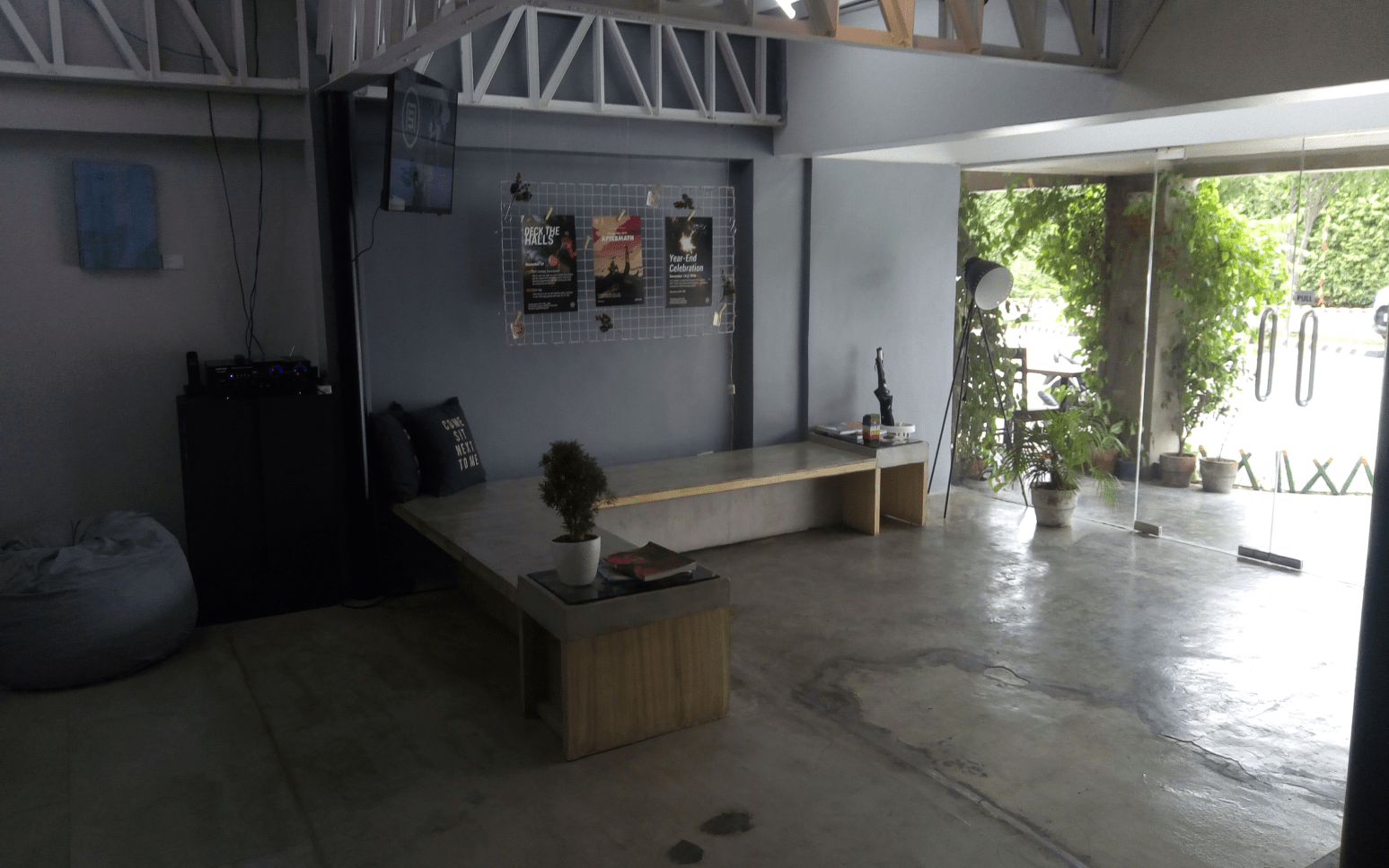 - The seating fits the design of the place: benches, stools and bean bags.